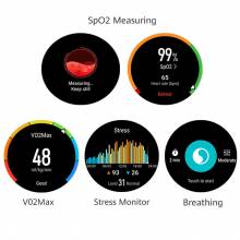GPS,GLONASS, Monitor de ritmo cardíaco, Monitor de sueño, Monitor de estrés, guía de VoiceOver en tiempo Real,Almacena y reproduce hasta 500 canciones, Pantalla de mensajes, buscar Teléfono, despertador, temporizador, clima |